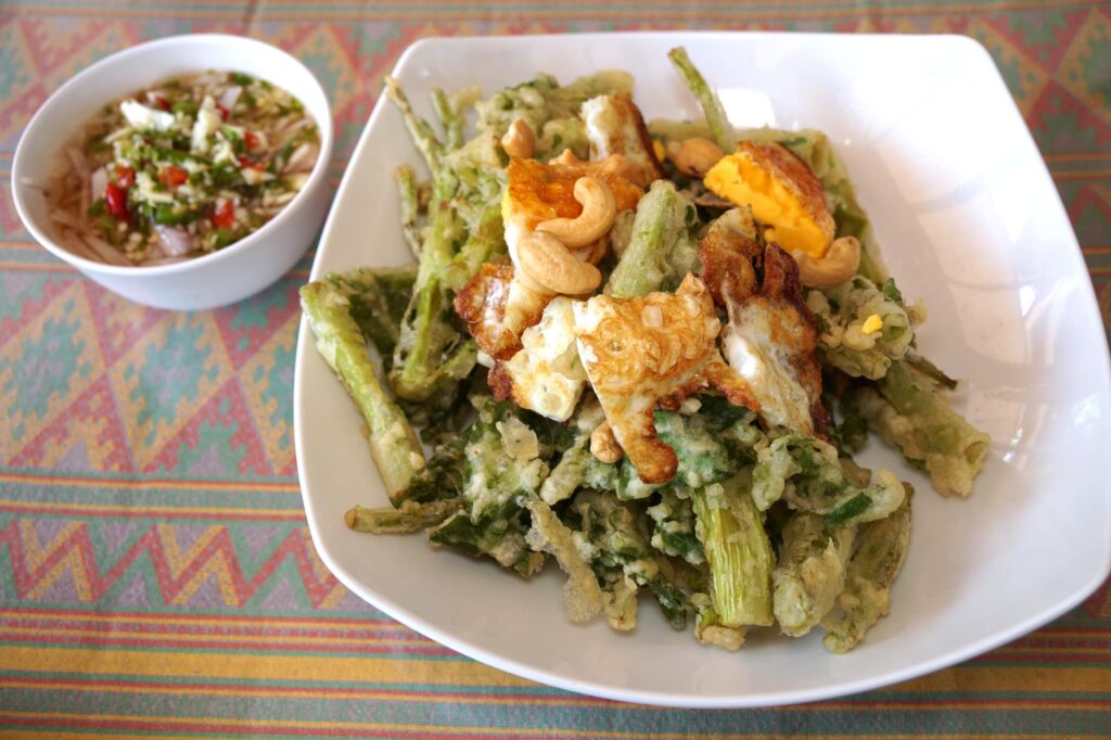 ผักบุ้งสดๆ ล้างน้ำจนสะอาด แล้วแป้งเเล้วทอดจนกรอบ ทอปด้วยไข่ดาวหั่นเป็นชิ้นๆ มีเมล็ดมะม่วงหิมพานต์เพิ่มมิติความกรอบ ราดน้ำยำรสชาติจัดจ้านลงไป … ลืมบอกไปว่าในน้ำยำยังมีทั้งกุ้งเเละหมึกอยู่ด้วยนะ (12/20)