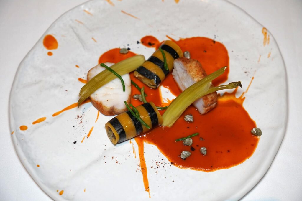 Secondi หรือเมนคอร์สจานแรกคือปลา Monkfish เตรียมมาในรูปแบบที่เรียกว่า Alla Puttanesca ซึ่งเป็นเมนูท้องถิ่นที่ได้รับความนิยมขึ้นมาจากแถบ Napoli ในช่วงศตวรรษที่ 20 ชิ้นปลา Monkfish มีความเฟิร์มและหนึบกว่าปลาเนื้อขายทั่วไปตัดเนื้อสัมผัสกับความกรอบจาก Baby Fennel ด้านล่างคือซอสสีส้มทำมาจากมะเขือเทศและมะกอก Taggiasca จากพื้นที่แถบทะเล Mediterranean มีกลิ่นหอมเฉพาะตัวแล้วเสริมรสชาติด้วยผงมะเขือเทศและเคเปอร์อีกทีหนึ่ง อีกหนึ่งองค์ประกอบสำคัญในจานคือ Seafood Cannelloni มีลักษณะเป็นพาสต้าแผ่นใหญ่มวนพันไส้ด้านในทำมาจากเนื้อปูจนนุ่มเด้งนั่นเอง (13/20)