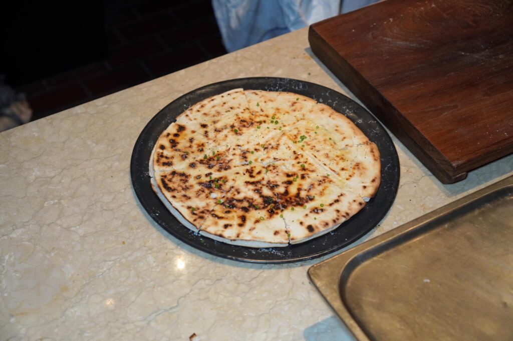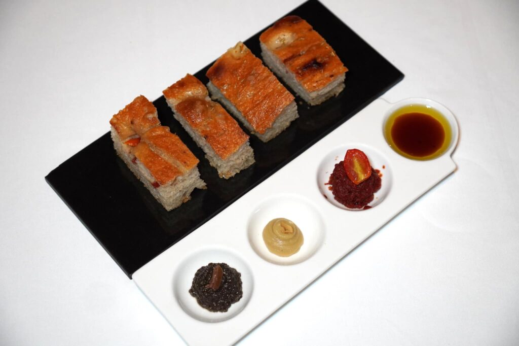ทางร้านนำเสิร์ฟขนมปัง Focaccia อุ่น ๆ คู่กับ Condiments ต่าง ๆ เริ่มจาก Olive Tapenade ที่มีส่วนผสมของแองโชวี่ ถัดมาคือ Garlic Cream ที่เมื่อปาดลงบนขนมปังแล้วจะให้กลิ่นคล้ายกันกับขนมปังกระเทียมสุดคลาสสิค อย่างที่สามคือ Sundried Tomato Paste ให้รสชาติเปรี้ยวอุมามิ สุดท้ายคือ Extravirgin Olive Oil with Pear Balsamic Vinegar โดยน้ำมันมะกอกที่คัดมาค่อนข้างเบา (Light) ไม่เข้มข้นเมื่อประกอบกันกับบัลซามิคที่มีอโรมาของลูกแพร์พบว่าเข้ากันได้ดีมาก ๆ