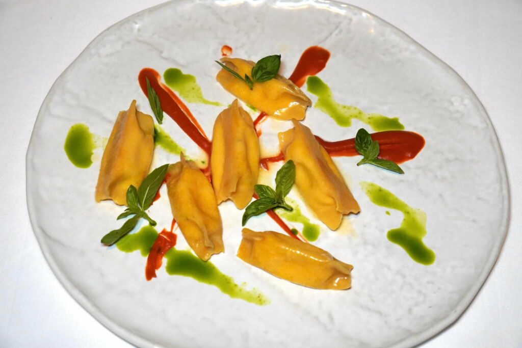 Stuffed with Ricotta and Burrata Cheese, Pappa al Pomodoro, Basil Oil