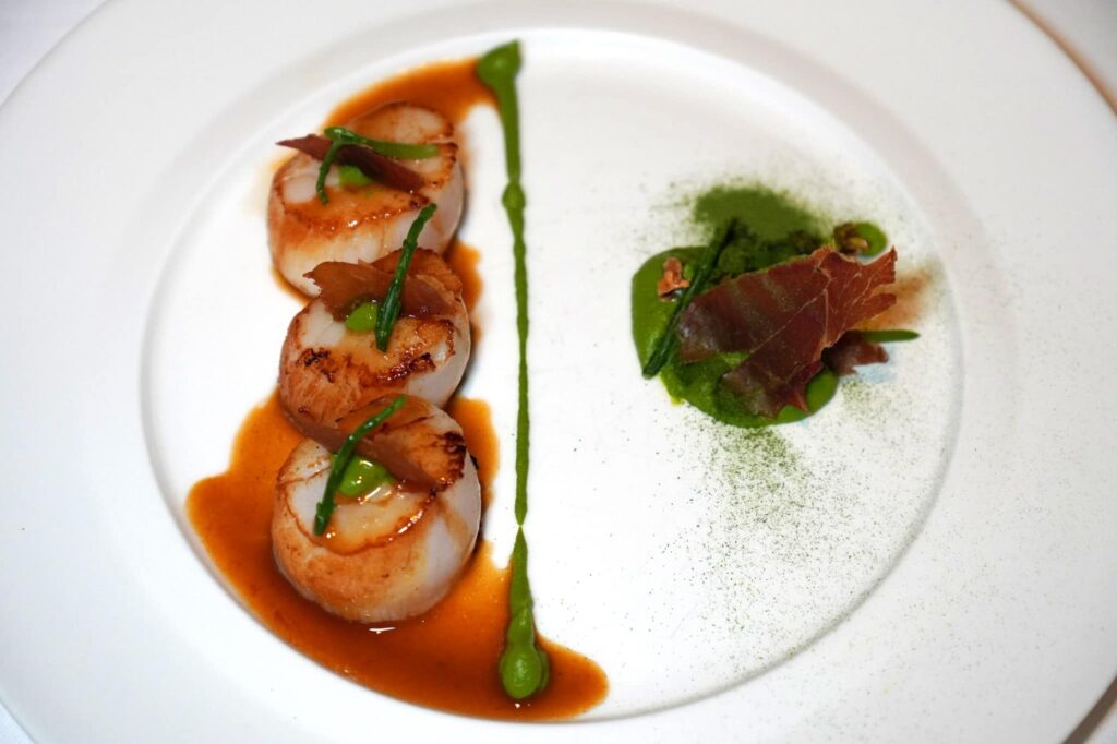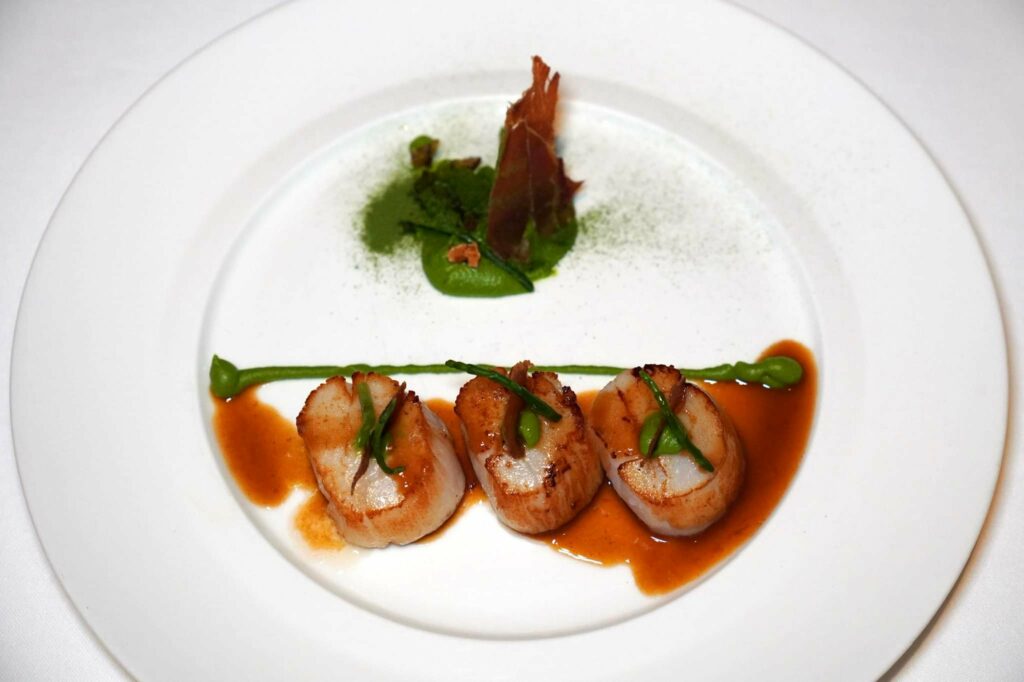 องค์ประกอบข้างกันคือพูเรถั่วลันเตารสหวานละมุน Prosciutto di Parma กรอบ ๆ เค็ม ๆ และถั่วอัลมอนด์คั่วกรอบช่วยเสริมมิติทางเนื้อสัมผัสให้กับหอยเชลล์ได้อย่างพอเหมาะ (14/20)