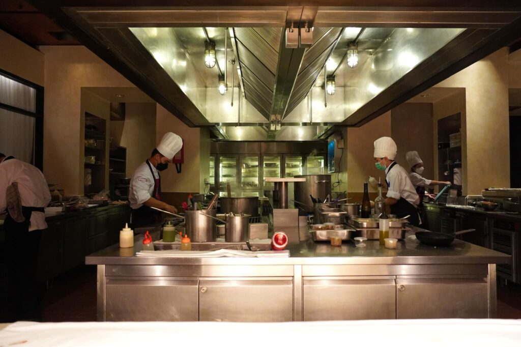 ตรงกลางเป็นครัวแบบ Open Kitchen ทำให้ทุกคนสามารถเพลิดเพลินกับการชมทีมเชฟจัดเตรียมอาหารได้ตลอดเวลา