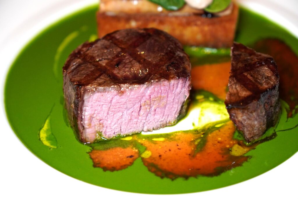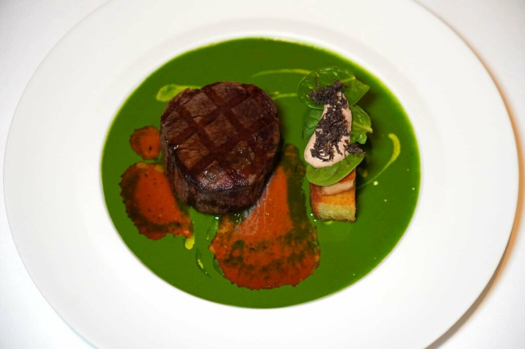 เนื้อวัววากิว A5 ส่วนสันในเสิร์ฟมาที่ความสุกระดับ Medium วางมาบนครีมผักโขมสีเขียวเข้ม ข้างกันคือ Pan Brioche กรอบฟูทอปด้วย Foie Gras ที่แพนเซียมาได้ระดับให้ความครีมมี่ตัดด้วยความเปรี้ยวหวานเข้มข้นของ Balsamic Reduction ยังมีใบผักโขมและทรัฟเฟิลขูดส่งอโรมาหอมฟุ้งขึ้นจมูก สุดท้ายที่โต๊ะพนักงานจะมาเทราดซอสไวน์แดงและทรัฟเฟิลรสชาติเข้มข้นลงไปในจาน (14/20)