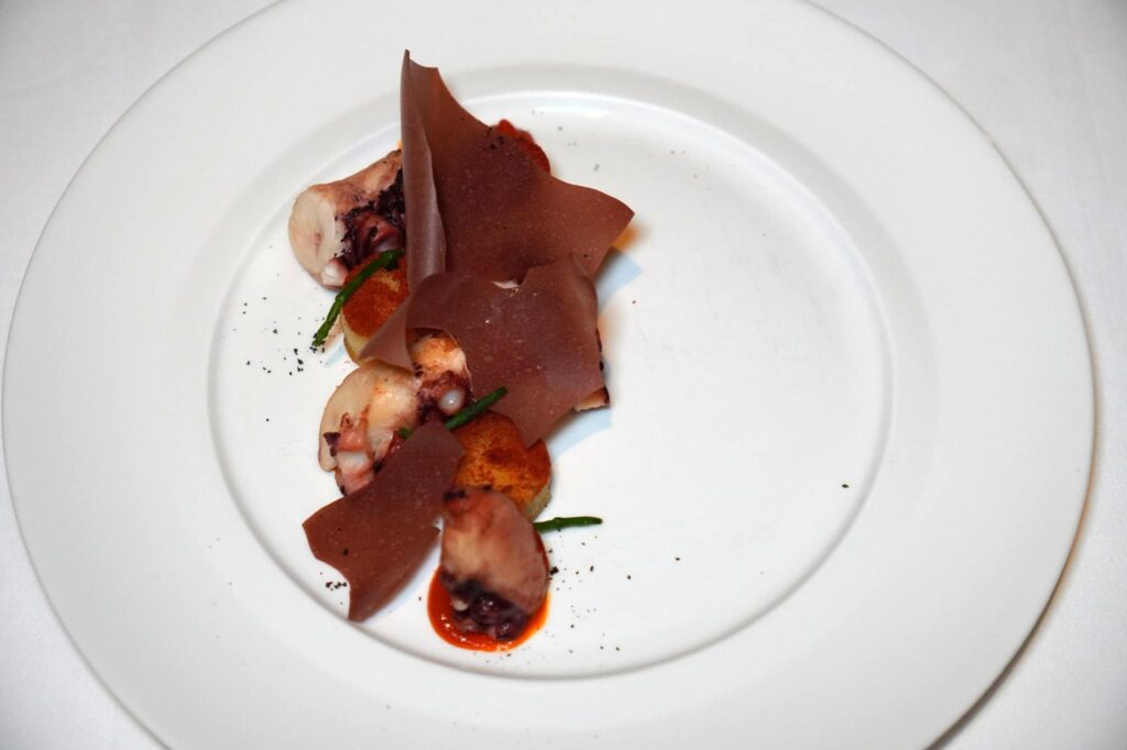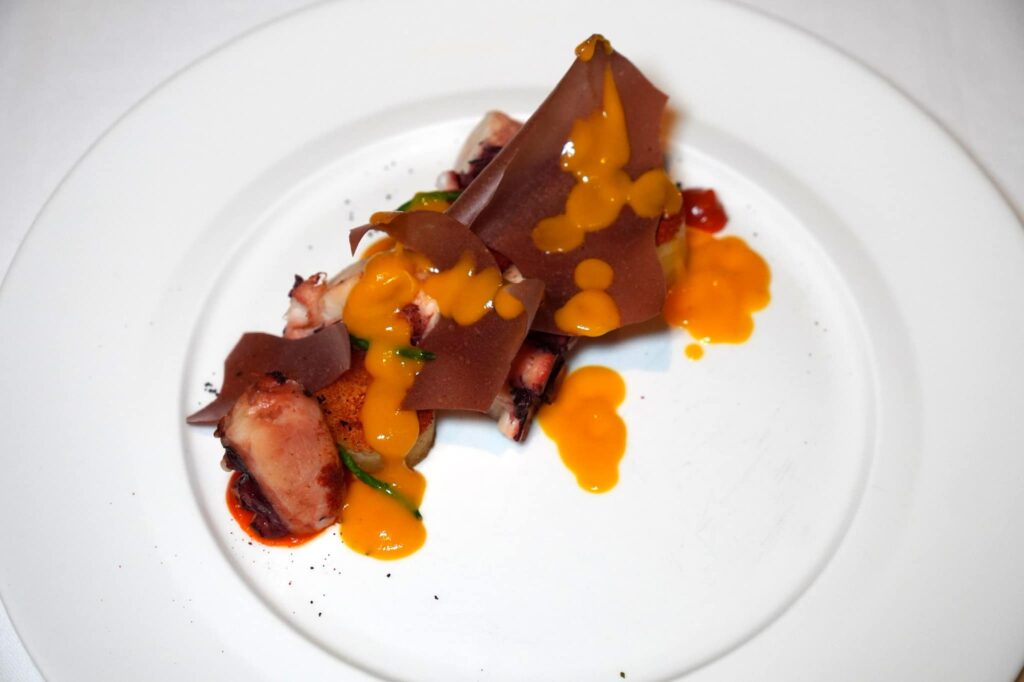 ต่อมาคือหนวดหมึกยักษ์จัดวางเรียงกันมาอย่างสวยงามขนาบข้างด้วยมันฝรั่งโรยด้วยผงปาปริก้า แผ่นสีส้มทำมาจากหนังของหมึกยักษ์ให้เนื้อสัมผัสค่อนข้างหนึบแต่ไม่ถึงกับเหนียวคล้ายมะม่วงกวนทั้งยังเสริมกลิ่นเฉพาะตัวของหมึกยักษ์ในรูปแบบที่แปลกใหม่ ไม่ซ้ำใคร องค์ประกอบด้านล่างสีส้มเข้มคือพูเรพริกหวาน ซาลิโคเนีย และผงมะกอกดำนั่นเอง (13/20)