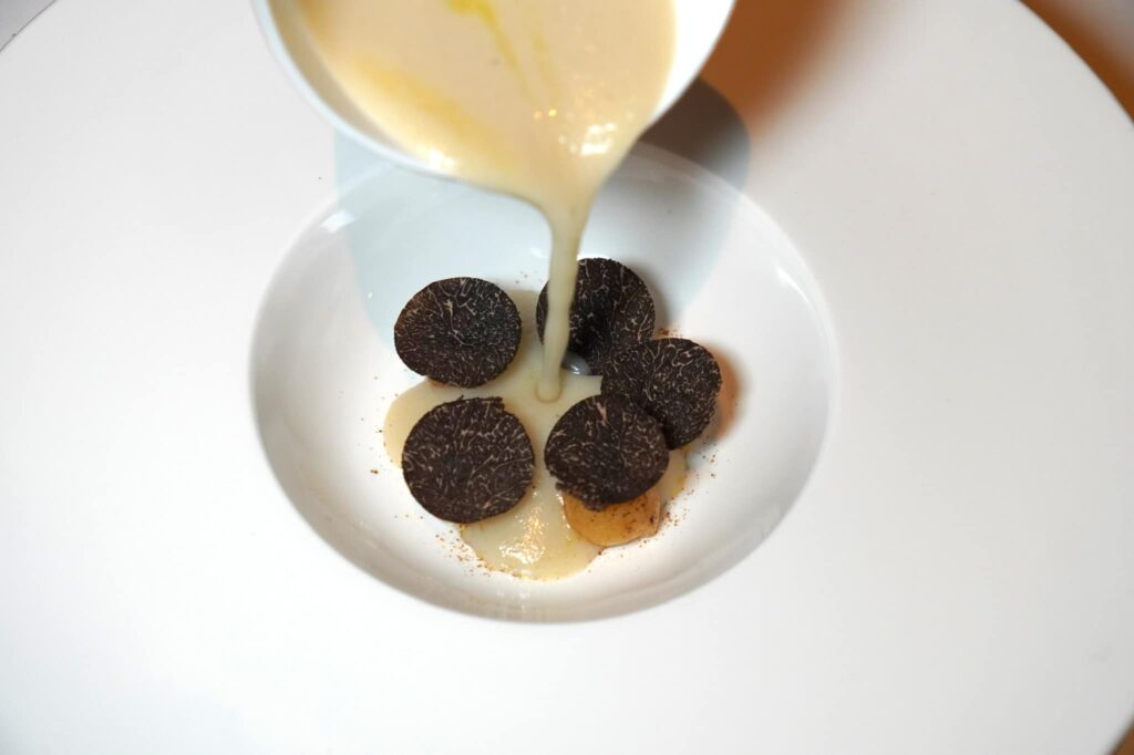 จากนั้นพนักงานจะเทซุป Topinambour หรือเยรูซาเล็มอาติโชคนำมาปั่นจนละเอียดแล้วผ่านการกรองอย่างดีจนได้เนื้อสัมผัสข้นคล้ายกันกับ Passata แต่ไม่ทิ้งความนุ่มละมุน มีกลิ่นหอมและอโรมาที่ดีของทรัฟเฟิลอย่างชัดเจน (14/20)