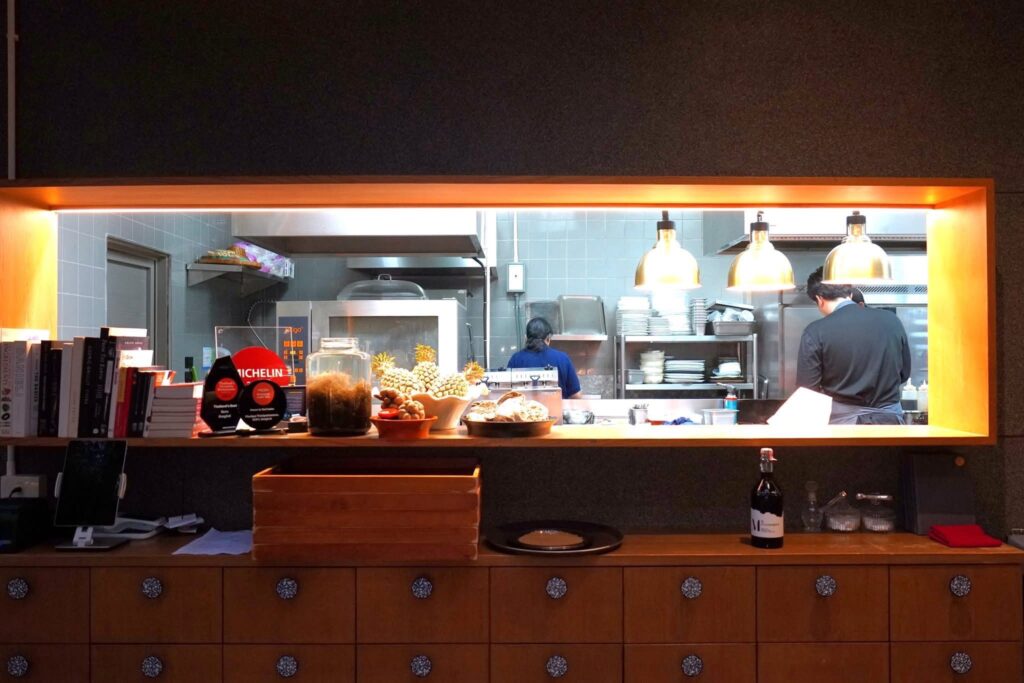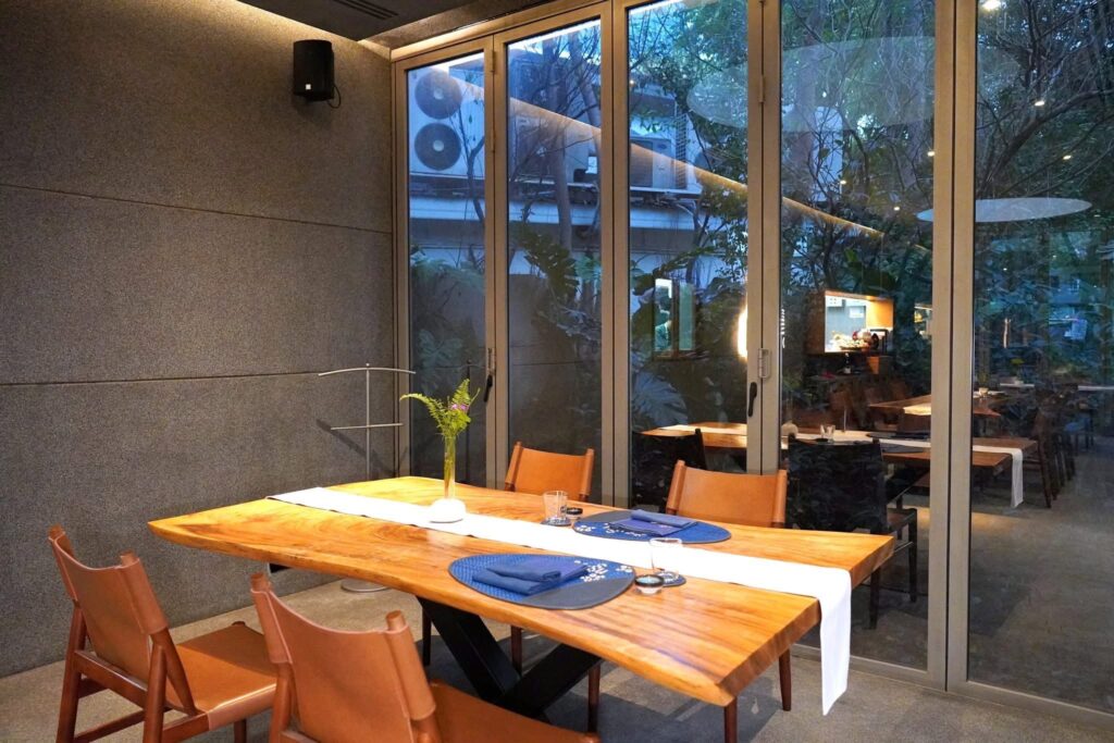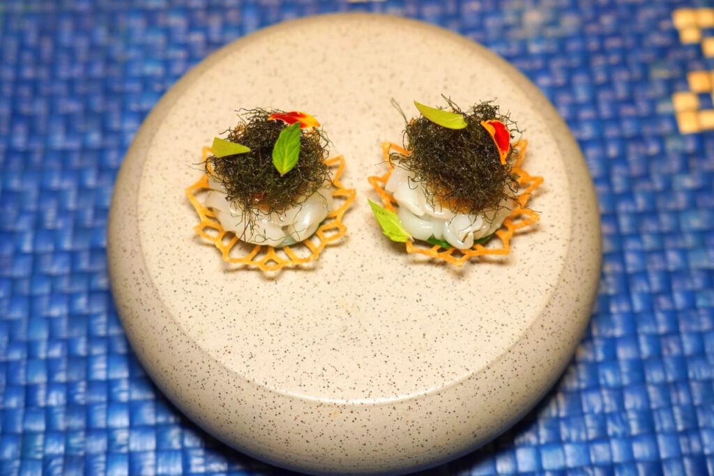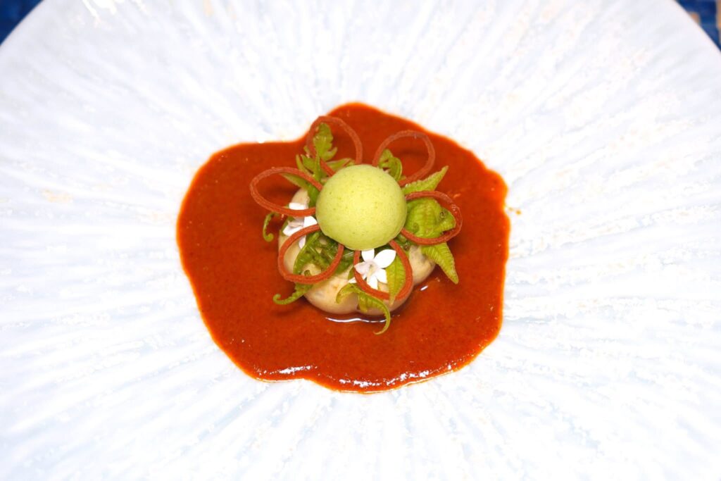 คอร์สนี้เชฟเสิร์ฟมาเป็นมูสหอยนางรมเนื้อเนียนจับคู่กับเนื้อกุ้งที่มีคสามสู้ฟัน ชั้นถัดมาคือผักจากภาคใต้นานาชนิดกับน้ำยำ ซอสรอบ ๆ เตรียมมาจากน้ำพริกเผาให้อโรมาหอมมันและรสชาติที่จัดจ้าน ยังมีมูสกระถินสีเขียวสร้างมิติทางกบิ่นและเนื้อสัมผัสที่ลงตัว (14/20)