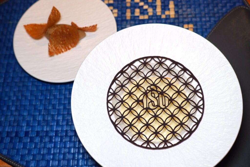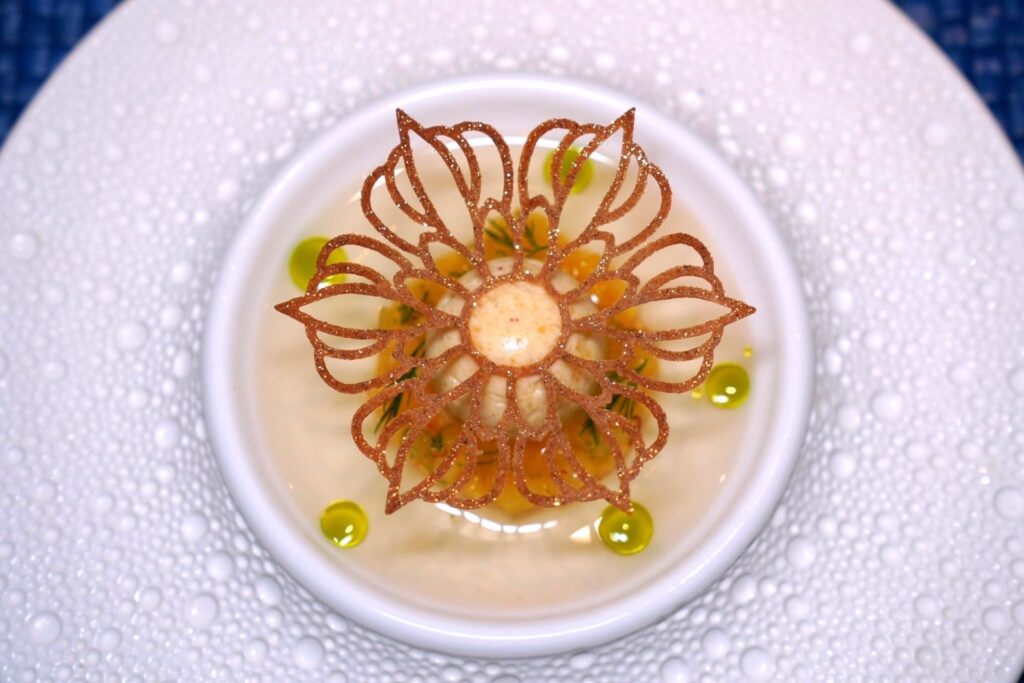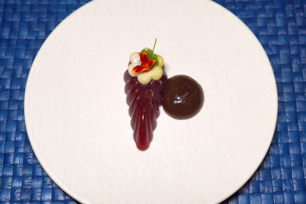 คอร์สนี้เชฟนำเสนอทุกองค์ประกอบของสับปะรดภูเก็ตไม่ว่าจะเป็นน้ำสับปะรดเตรียมมาเป็นลูกทรงกลม แกนสับปะรดเตรียมมาเป็นกอมโปต เชฟใส่พริกแห้งและใบมิ้นต์ลงไปด้วย ซอสรอบ ๆ เตรียมมาจากน้ำสับปะรดที่ผ่านการ Clarified จนใสแล้วปรุงรสชาติด้วยน้ำองุ่นจาก GranMonte ที่มีความเปรี้ยวโดดมาช่วยบาลานซ์รสหวานนั่นเอง (15/20)