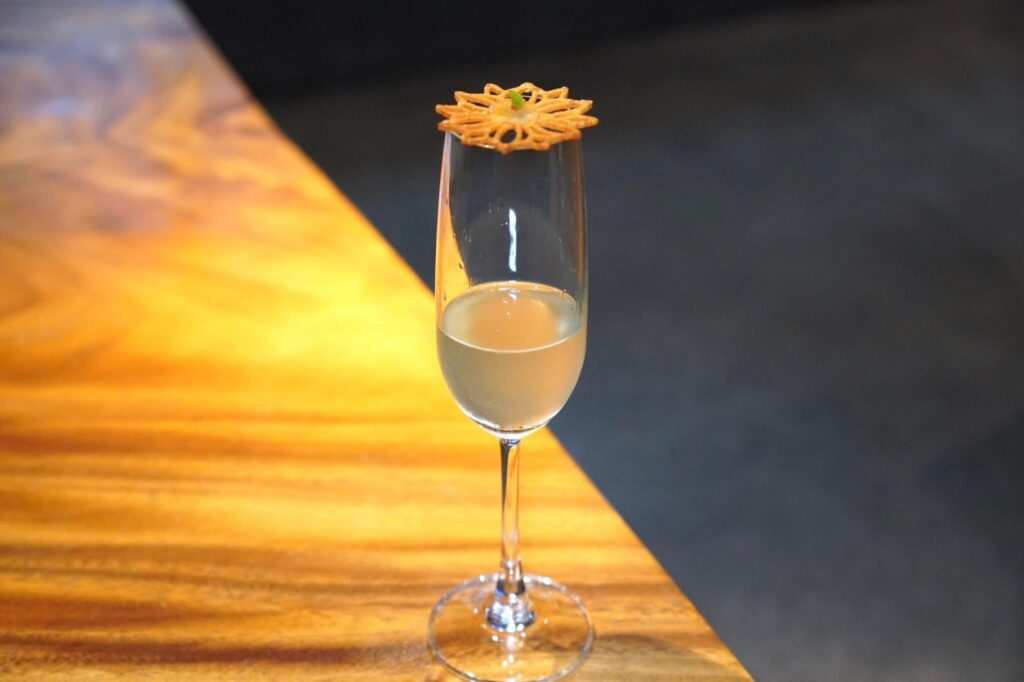 เริ่มต้นคำแรกด้วยยำสายโดยเชฟเตรียมมาเป็นมินิทาร์ตมันแกวกรอบ ๆ ชั้นถัดมาคือเส้นหมึกที่ผ่านการ Cured กับผิวมะนาว จากนั้นเป็นชั้นของใบชะพลู ยังมีสาหร่ายผมนางทอดกรอบรวมไปถึงน้ำยำรสชาติจัดจ้านอีกด้วย (14/20)