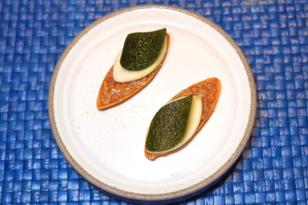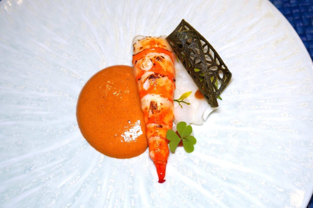 เนื้อกุ้งแม่น้ำตาปีย่างมาสุกพอเหมาะไร้ที่ติ มีกลิ่นหอมโดดเด่น ไฮไลต์คือซอสเคยฉลูจากจังหวัดกระบี่ที่มีอัตราส่วนของโซเดียมน้อยกว่าเคยทั่วไป เชฟนำไปทำเป็น Espuma โดยใช้เครื่องไซฟ่อน ข้าง ๆ กันคือมันแกวดองและแผ่น Tuile ใบเล็บครุฑกรอบที่แตกทันทีที่ได้เคี้ยว (15/20)