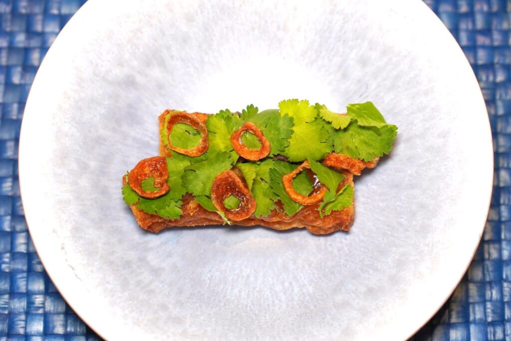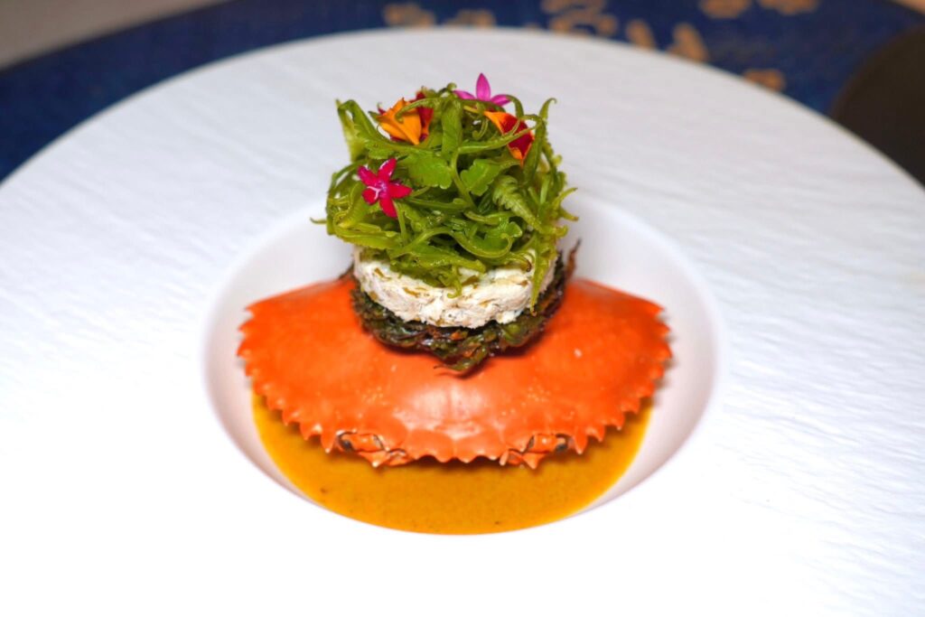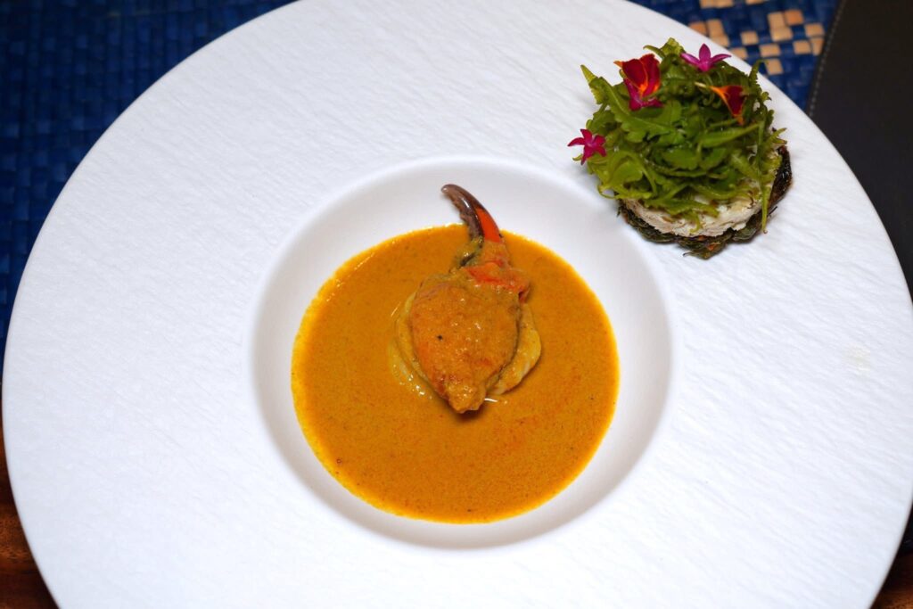 คอร์สนี้เชฟเสิร์ฟมาเป็นขนมจีนแกงปูและเบือทอด องค์ประกอบแรกคือใบเล็บครุฑทอดกรอบ ๆ จับคู่มากับชั้นของเนื้อปูกับกะทิ จากนั้นท็อปด้วยยอดผักกูดสด (14/20)