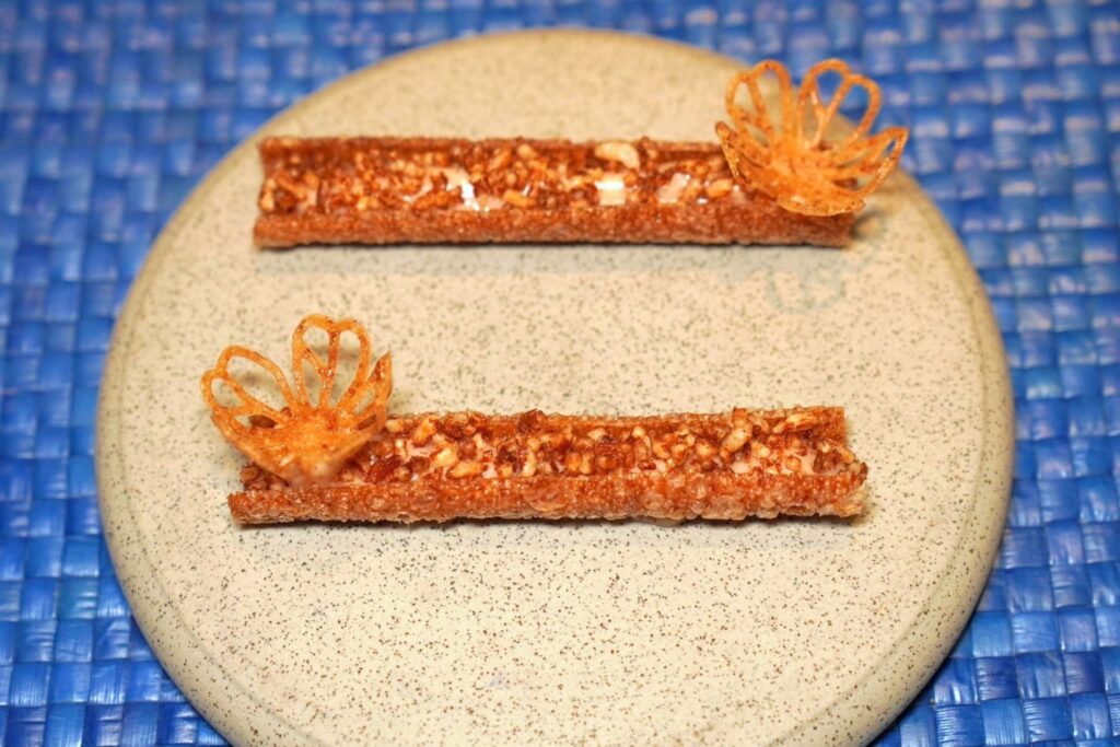 ทาร์ตข้าวเกรียบที่บรรจุมูสข้าวสังข์หยด เชฟเพิ่มมิติทางเนื้อสัมผัสโดยการใส่ข้าวพองและแผ่น Tuile มันแกวอยู่ด้วย (13/20)
