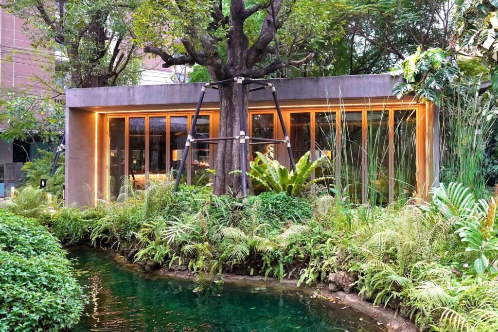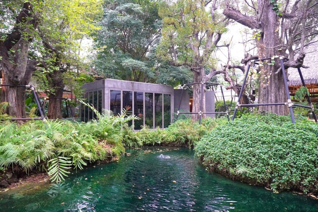 การตกแต่งได้รับแรงบันดาลใจมาจาก “สระมรกต” หนึ่งในสมบัติจากเมืองกระบี่ที่ตั้งใจย่อส่วนมาไว้กลางเมืองหลวง ต้นไม้ในสวนจำนวนมากช่วยตัดความจอแจจากถนนใหญ่ได้อย่างแนบเนียน