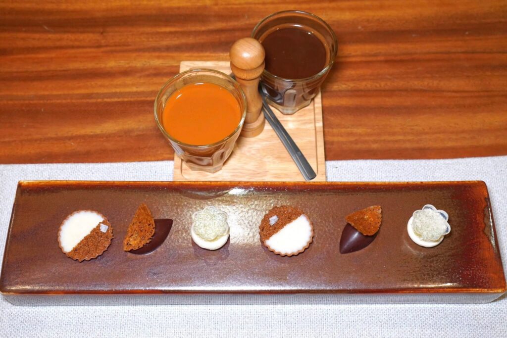 ปิดท้ายด้วยของหวานจิ๋ว 3 อย่างคือทาร์ตข้าวสังข์หยดทฃจับคู่กับขนมขี้มัน ด้านบนคือขี้โล้และดอกเกลือ ถัดมาคือช็อกโกแลตจากจัวหวัดชุมพรสอดไส้เจบดอกดาหลา สุดท้ายคือขนมมัน ด้านล่างคือเมอแรงก์น้ำมะพร้าว ด้านบนท็อปด้วยเจลลี่น้ำมะพร้าว นอกจากนี้ยังมีกาแฟโกปี๊ชุมพรลุงพาณิชย์หรือชาชักป้าติ๋วเสิร์ฟมาด้วย