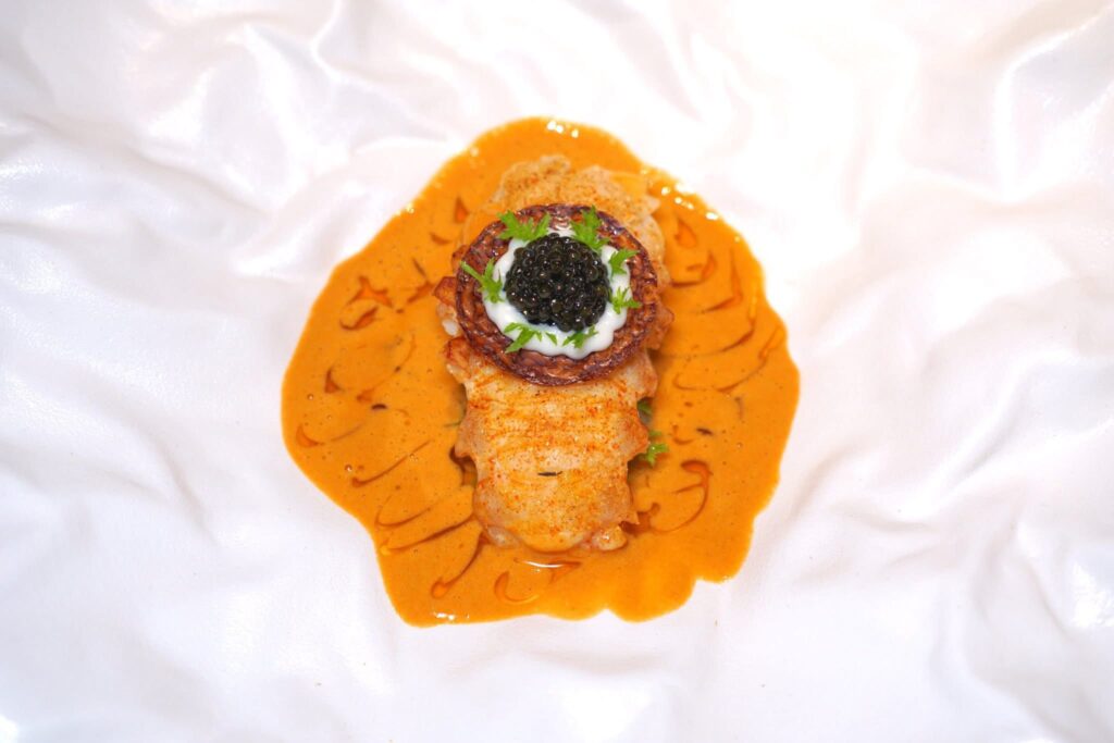 กุ้งล็อบสเตอร์จากหาดราไวย์ที่เชฟนำไปนึ่งต่อด้วยการซูวี จากนั้นจบด้วยการเผาเล็กน้อยเพื่อสร้างอโรมาหอม ๆ ของการย่างถ่าน ยังมีแอปเผิ้ลที่ปรุงในคอมบุฉะแอปเปิ้ลโฮมเมดสร้างความเปรี้ยวที่สมดุล ด้านบนคือแผ่นกรอบที่เตรียมมาจากส่วนที่เหลือของล็อบสเตอร์ รอบ ๆ คือซอสกุ้งล็อบสเตอร์ที่ผ่านการเคี่ยวมาอย่างดีและน้ำมันล็อบสเตอร์สร้างความหอม มัน และครีมมี่ สุดท้ายคือความอุมามิที่ได้จากออสซีตร้าคาเวียร์จากฟาร์มในแถบเวนิส