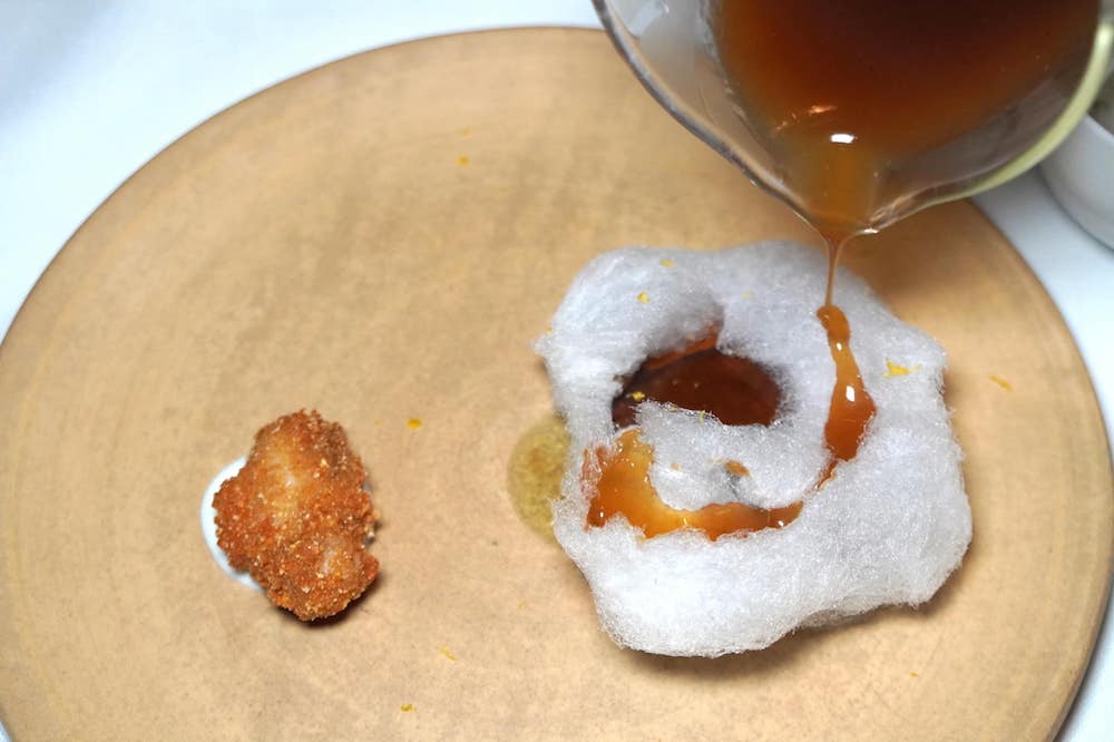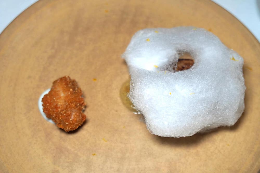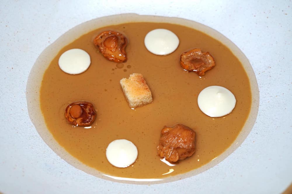 tortell d’Olotด้านบนมีมาโยสีขาวทำจากเห็ดเช่นกัน มีชิ้นเห็ดนุ่มหนึบและ Tortell d’Olot ซึ่งเป็นขนมปังพื้นเมืองทรงโดนัทของเมือง Olot ที่ตั้งของห้องอาหารแห่งนี้ (17/20)