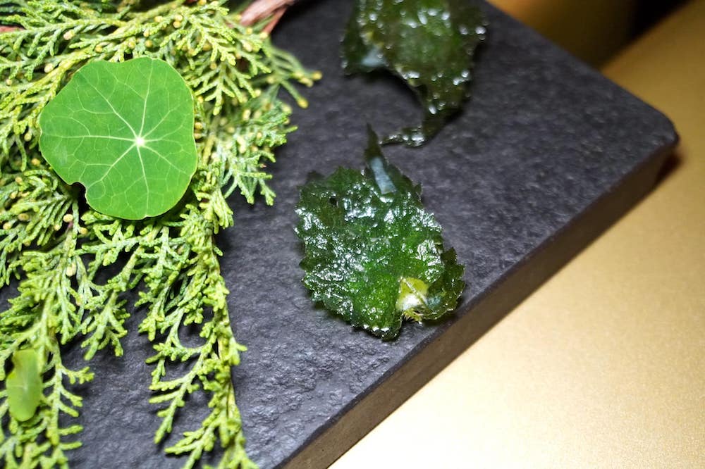 เริ่มต้น Amuse Bouche ด้วยใบเบลีฟทำออกมาให้กรอบทานได้ทอปด้านบนด้วยอีมัลชั่นหอมมัน (14/20)