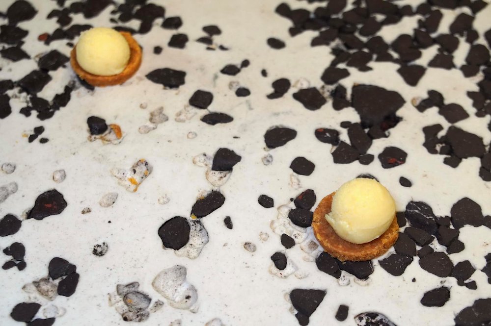 cornอีกชิ้นหนึ่งเป็นแผ่นแป้งทำมาจาก Fajol หรือ Buckwheat วัตถุดิบท้องถิ่นสำคัญซึ่งพบได้เฉพาะพื้นที่แถบ La Garrotxa จากบริเวณแคว้น Catalonia ทั้งหมดเชฟเลือก เสิร์ฟมาคู่กับซอร์เบท์ข้าวโพดที่มีกลิ่นหอมเฉพาะตัวโดดเด่นมาก ๆ (15/20)