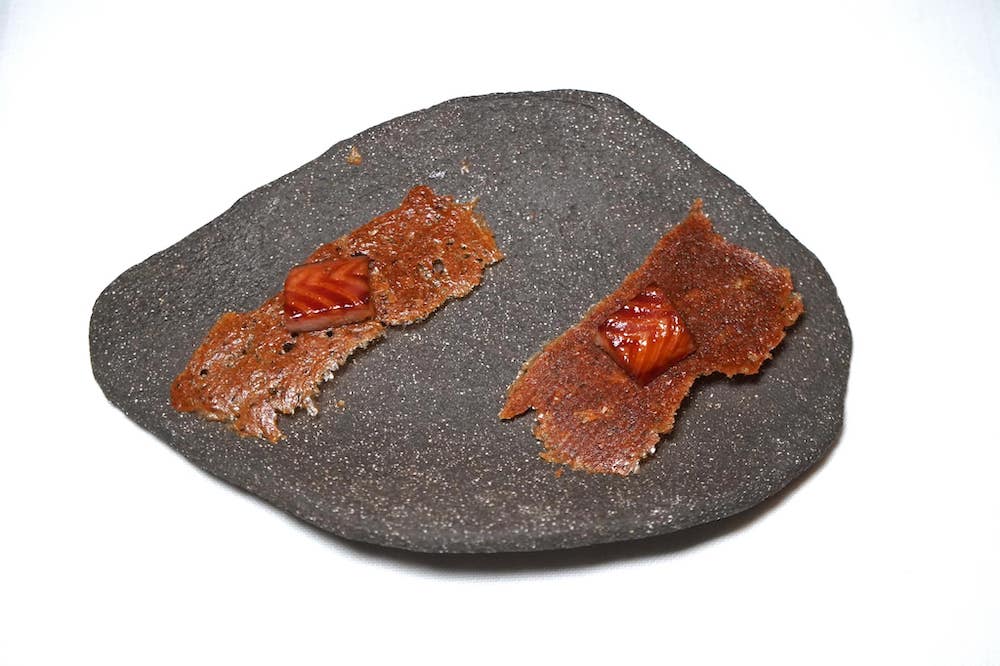 the land, the waterซุปภูเขาไฟนำเสิร์ฟมาคู่กับแผ่นกรอบทำมาจาก Buckwheat ทอปด้านบนด้วยเนื้อปลาไหลน้ำจืดซึ่งหาได้จากแถบนี้รมควันจนสุกพอดี มีกลิ่นหอมเด่นชัด เนื้อสัมผัสนุ่มตัดกันกับความกรอบของแผ่นกรอบด้านล่าง (18/20)