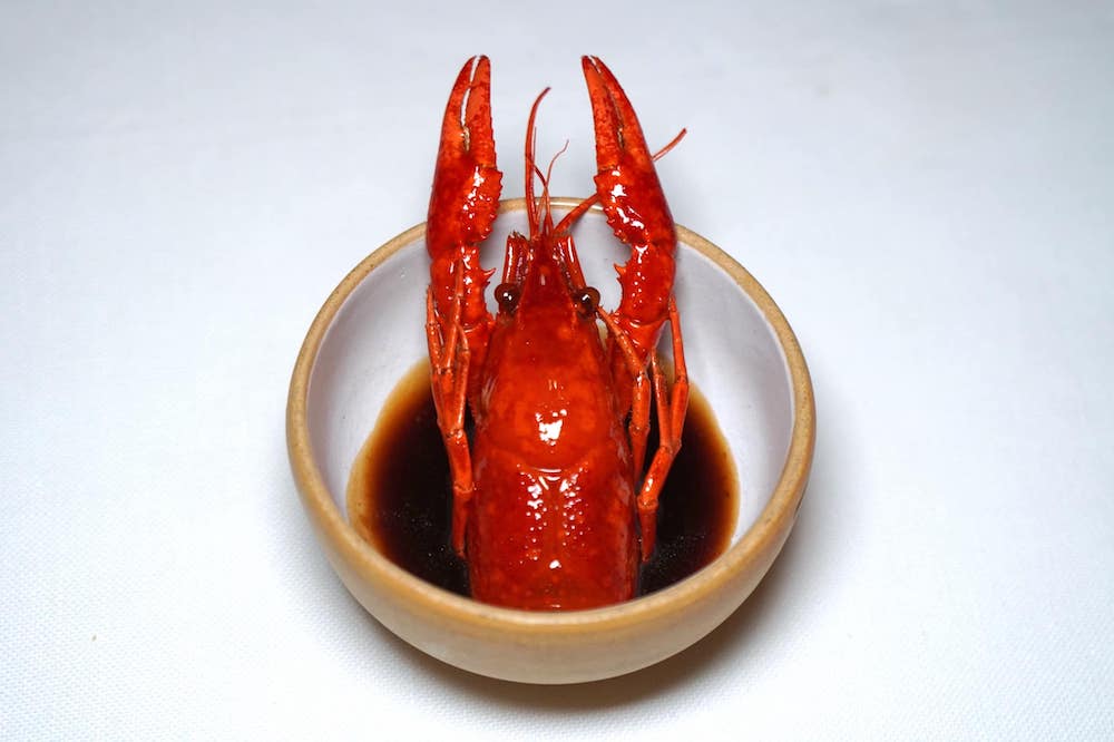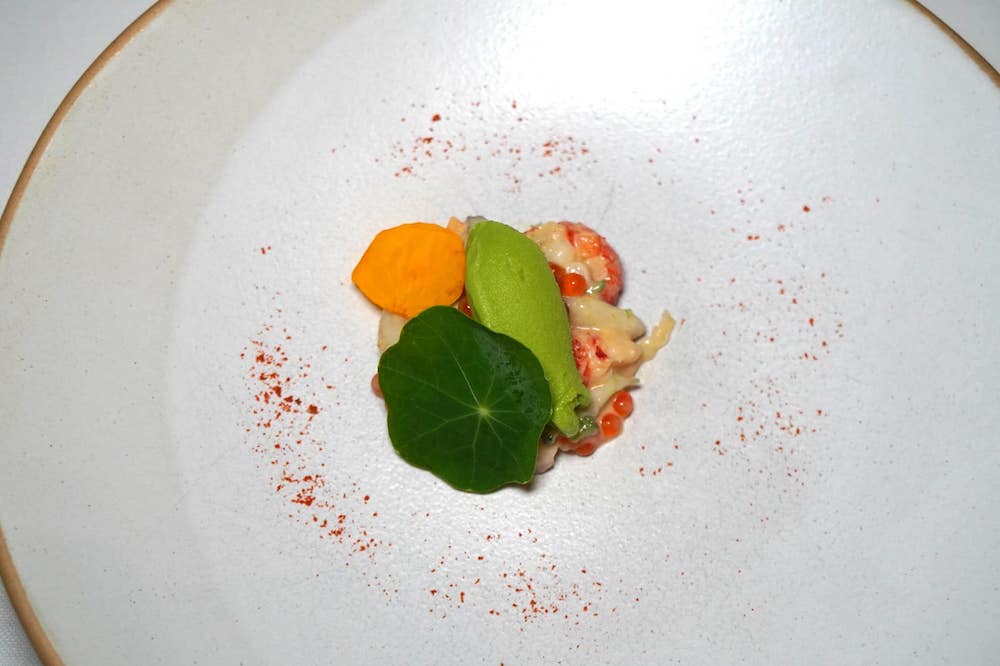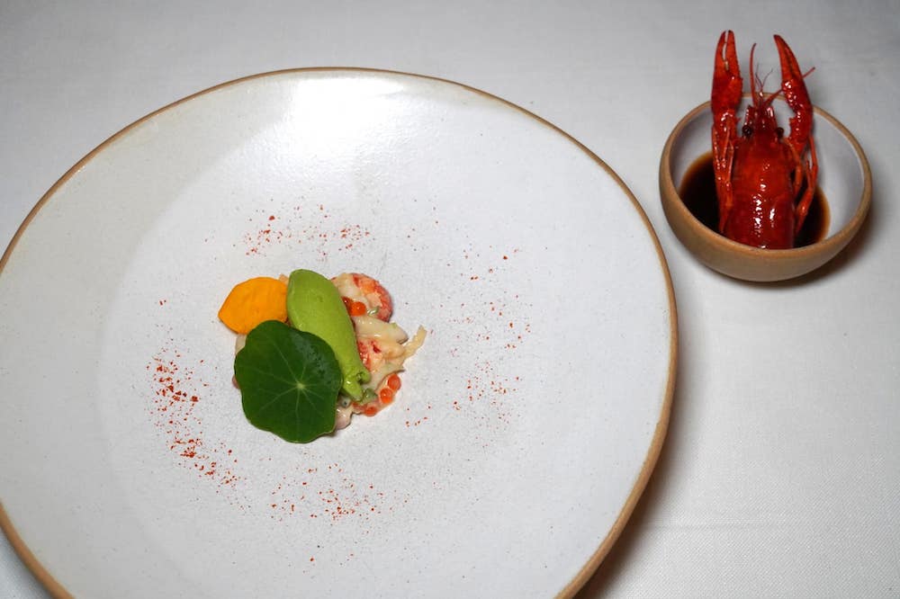 eel, trout, frog’s legsรับประทานกับสลัดที่ใช้วัตถุดิบจากทะเลสาบอันประกอบไปด้วยเนื้อปลาไหลน้ำจืด ไข่ปลาเทร้าต์ และขากบ แต่ละองค์ประกอบมีความนุ่มที่แตกต่างกันออกไปโดยเฉพาะขากบที่นุ่มจนเราประทับใจเอามาก ๆ ยังมีพืชผักต่าง ๆ และสมุนไพรแหล่งน้ำจืดทำเป็นซอร์เบท์ช่วยล้างความเข้มข้นจากความมันของหัวกุ้งเครฟิชได้เกือบหมด (17/20)