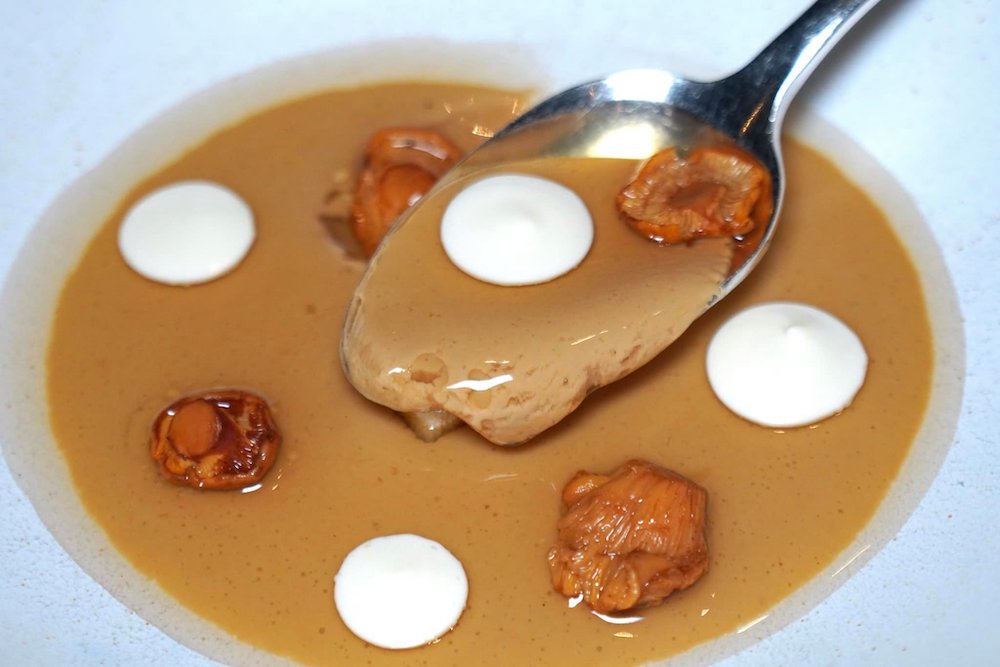 tortell d’Olotชานเทอเรลเป็นหนึ่งในเห็ดป่าที่เราชอบมากที่สุด จานนี้เชฟใช้เห็ดที่ขึ้นในพื้นที่แถบ La Garrotxa นำมาทำเป็นรอแยลลักษณะคล้ายพานาคอตต้า ทั้งนุ่มและหอม ส่วน Earthy Aroma ยังมีมาไม่มากจนเกินไปอีกด้วย (17/20)
