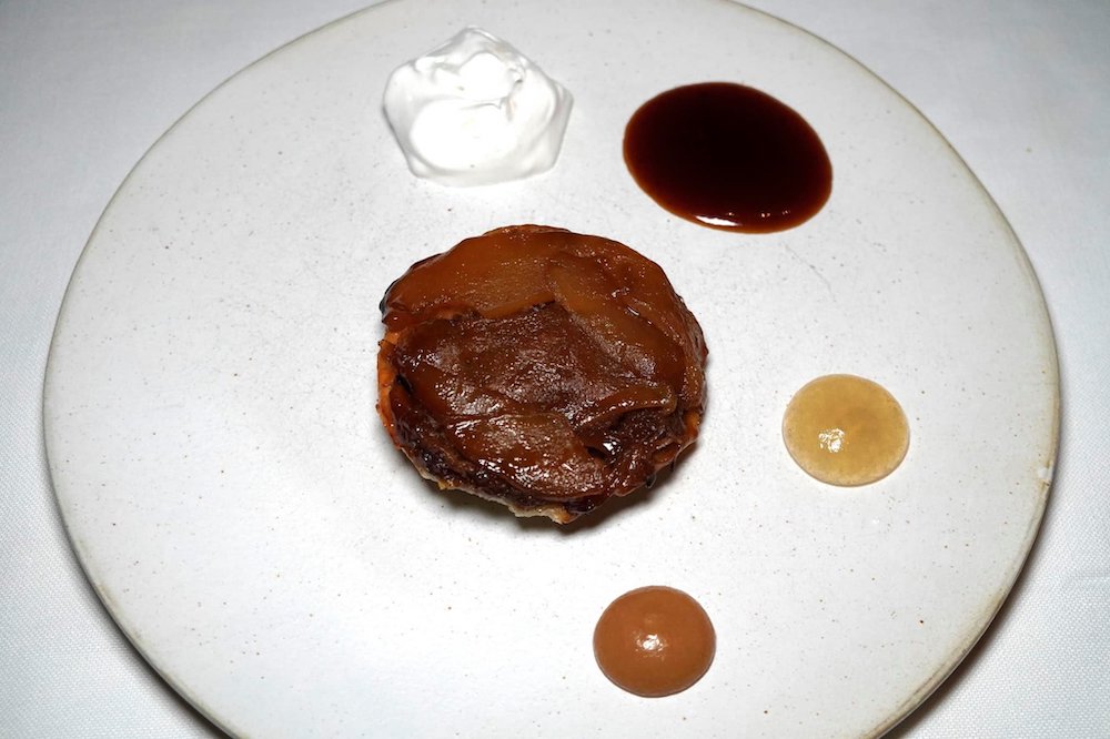 pear chantilly, acornแนวคิดของอาหารจานนี้คือการนำเมนูของหวานคลาสสิคอย่าง Apple Tartin มาปรับเปลี่ยนรูปแบบให้กลายเป็นอาหารคาวโดยการนำเนื้อเป็ดเสิร์ฟมากับลูกแพร์ในแป้งทาร์ต เนื้อเป็ดที่มีความนุ่มหนึบจะให้เนื้อสัมผัสอยู่ตรงกลางระหว่างลูกแพร์ที่นุ่มจนแทบละลายในปากกับแป้งทาร์ตกรอบ รสชาติออกหวานแต่ก็ยังไม่ทิ้งความหอมมันจากเนื้อเป็ด เสิร์ฟมากับครีมที่รังสรรค์ขึ้นมาโดยเลียนแบบเลียนแบบ Crème Chantilly ทำมาจากลูกแพร์ ถัดมาคือสีเข้มที่ได้จากการ Reduction น้ำเป็ดจนงวดและให้รสชาติที่เข้มข้น ต่อด้วยซอสสีเหลืองอ่อนทำมาจากไวน์หวาน Muscadelle และซอสสีน้ำตาลอ่อนทำมาจากลูกแพร์ (17/20)