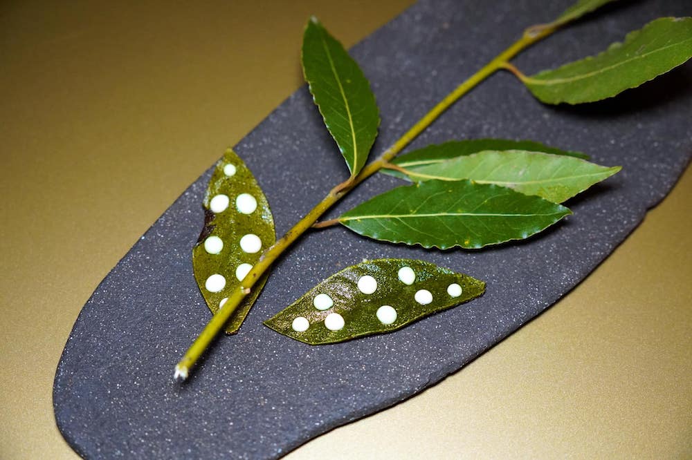 three-colour olivesจานนี้คือผัก ดอกไม้ และสมุนไพรหลายชนิดห่อมาให้ในขนาดพอดีคำมีเนื้อสัมผัสกรอบ วิธีรับประทานให้นำผักจิ้มกับซอสที่ทำมาจากมะกอก 3 ชนิดซึ่งให้กลิ่นหอมและรสชาติที่แตกต่างกัน (16/20)
