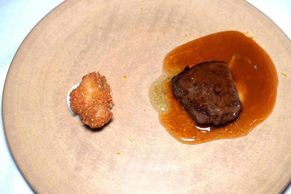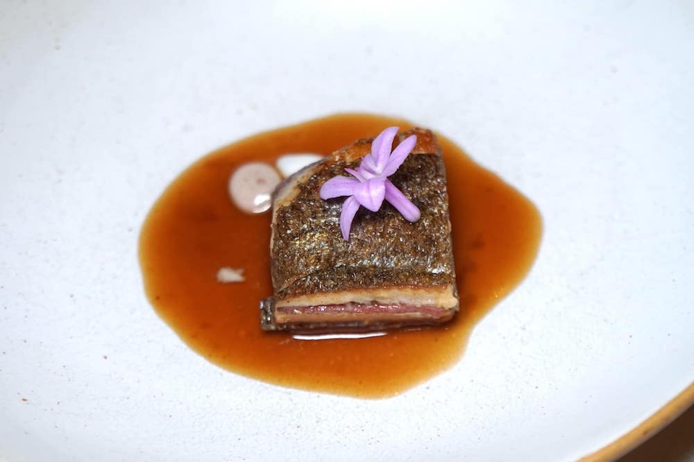 broth, garlic flowerคอร์สนี้เชฟเลือกนำเสนอวัตถุดิบพื้นถิ่นสองอย่างคือปลาเทร้าต์น้ำจืดและ Jabugo Ham ผสานกันมาในอาหารจานเดียวโดยทำเป็นมิลเฟยที่มีเลเยอร์ของเนื้อปลาเทร้าต์คั่นด้วย Jabugo Ham สลับกันนั่นเอง ซฮสรอบ ๆ ทำมาจาก Jamón ทอปด้านบนด้วยดอกกระเทียมที่แม้ไม่ได้มีส่วนเกี่ยวข้องใด ๆ กับกระเทียมแต่ให้กลิ่นคล้ายกระเทียมตามธรรมชาตินั่นเอง (17/20)