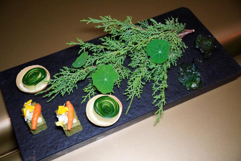 the land, the waterในคอร์สนี้เชฟ Fina นำเสนอ Volcanic Broth น้ำซุปที่ทำมาจาก Volcanic Crops หรือพืชผักท้องถิ่นซึ่งเติบโตมาในแถบดินภูเขาไฟ จากนั้นพนักงานจะนำหินภูเขาไฟสีดำร้อน ๆ จุ่มลงไปเพื่อทำให้น้ำซุปเดือดพล่านต่อหน้าลูกค้าทั้งยังเป็นการ Infuse อโรม่าของภูเขาไฟลงไปในน้ำซุปอีกด้วย (18/20)