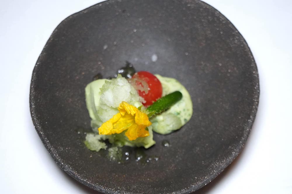 ล้างปากด้วยผักที่ปลูกในสวนของห้องอาหาร Les Cols เอง โดยมีกลิ่นจากครีมแตงกวาค่อนข้างเด่น เสิร์ฟมากับมะเขือเทศ ปรุงรสด้วยเกลือเล็กน้อย (15/20)