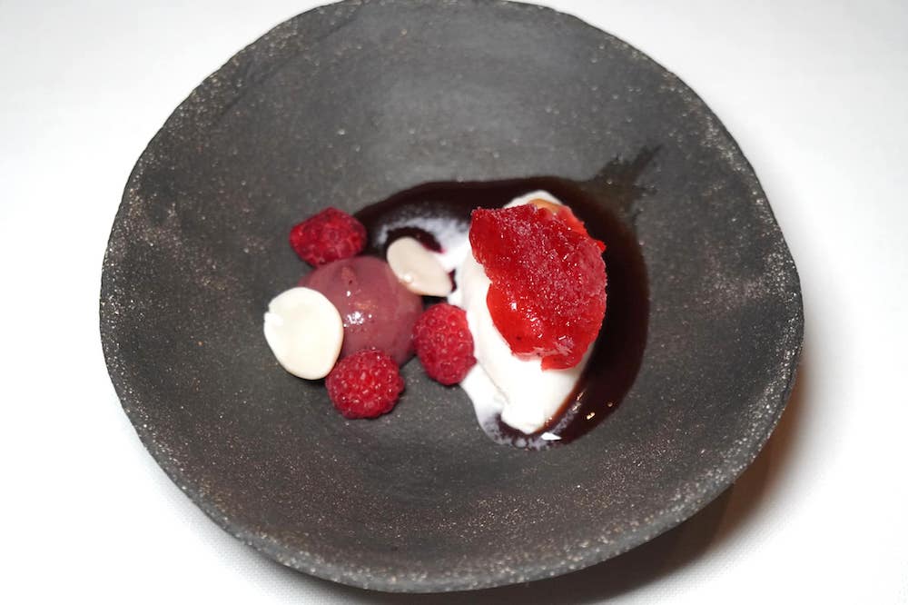 อีกหนึ่งเมนูไฮไลท์ในมื้อนี้คือจานที่นำเสนอองค์ประกอบต่าง ๆ จากแกะออกมาได้อย่างน่าสนใจเริ่มจากตับแกะที่ถูกปกคลุมด้วยสิ่งที่ดูหน้าตาคล้ายขนแกะ อีกฝั่งหนึ่งคือสวีทเบรดหรือส่วนต่อมไทมัสของลูกแกะ จากนั้นพนักงานจะเทราดซอสที่ได้จากการ Reduction แกะจนเข้มข้นลงไปบนขนแกะซึ่งจะค่อย ๆ ละลายหายไป ตับแกะถูกเตรียมออกมาได้ดีมาก ๆ ผิวด้านนอกกรอบนิด ๆ ด้านในนุ่มละมุน ไม่มีกลิ่นคาวแม้แต่น้อย สวีทเบรดกรอบนอกนุ่มใน ไร้ที่ติ เรียกได้ว่าเป็นสวีทเบรดที่ดีที่สุดร้านหนึ่งเท่าที่เรยพบเจอมา น้ำซอสเข้มข้นพอเหมาะช่วยส่งเสริมรสชาติของแกะให้เด่นชัดมากยิ่งขึ้น (19/20)
