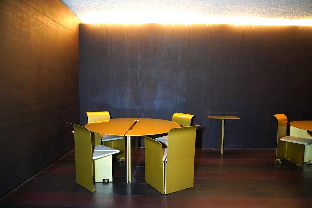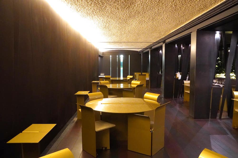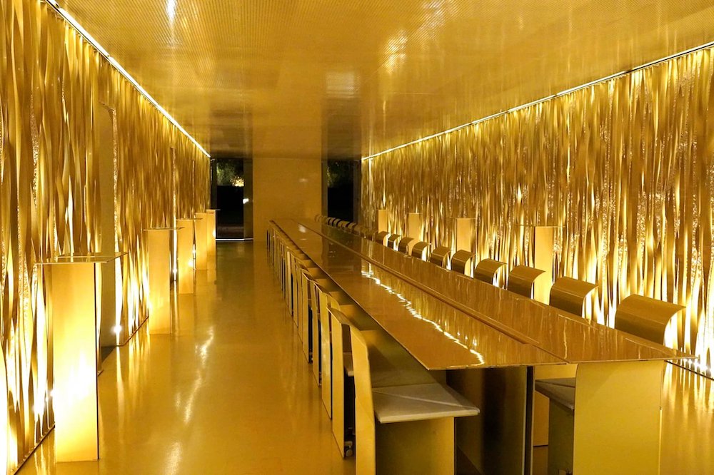 บริเวณกลางร้านมีโต๊ะสีทองยาวสำหรับรองรับลูกค้าที่มาเป็นกลุ่มได้มากถึง 40 คน ผนังส่วนนี้เต็มไปด้วย Slat หรือระแนงทรงเกลียวสีทอง