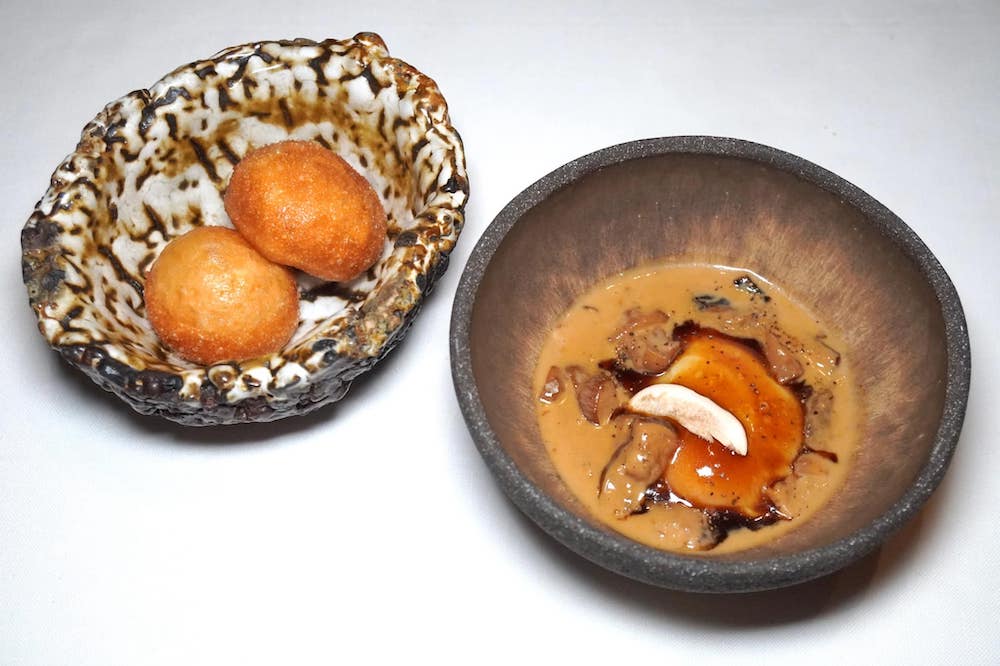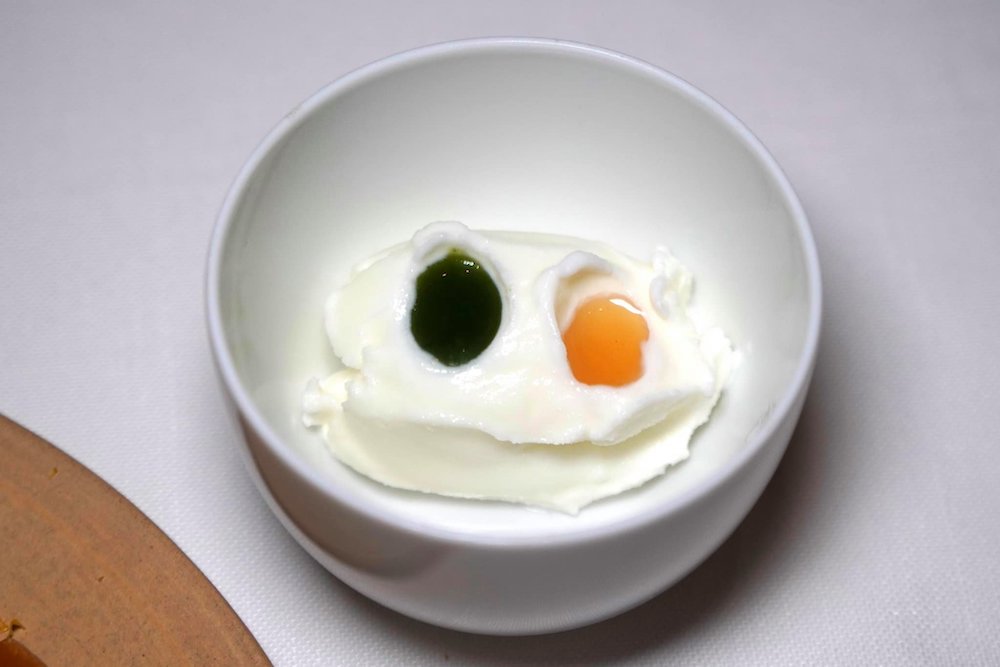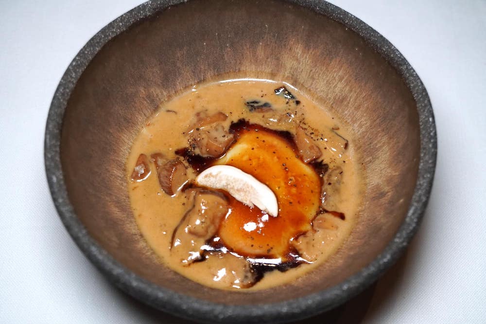 จานนี้มีวัตถุดิบหลักคือไข่ไก่ที่ได้มาจากเล้าไก่หน้าร้าน เชฟนำเสนอมาคู่กับเห็ดป่าได้อย่างลงตัวโดยใช้ไข่ไก่ดิบเสิร์ฟมาด้วยกันกับเห็ดป่าทั้งดิบและสุกช่วยเสริมเนื้อสัมผัสให้เกิดความแตกต่าง น้ำซอสทำมาจาก Chicken Reduction เข้มข้น วิธีรับประทานให้นำขนมปังที่ทางร้านอบแล้วทอดจนกรอบจุ่มลงไปในไข่ได้เลย (18/20)