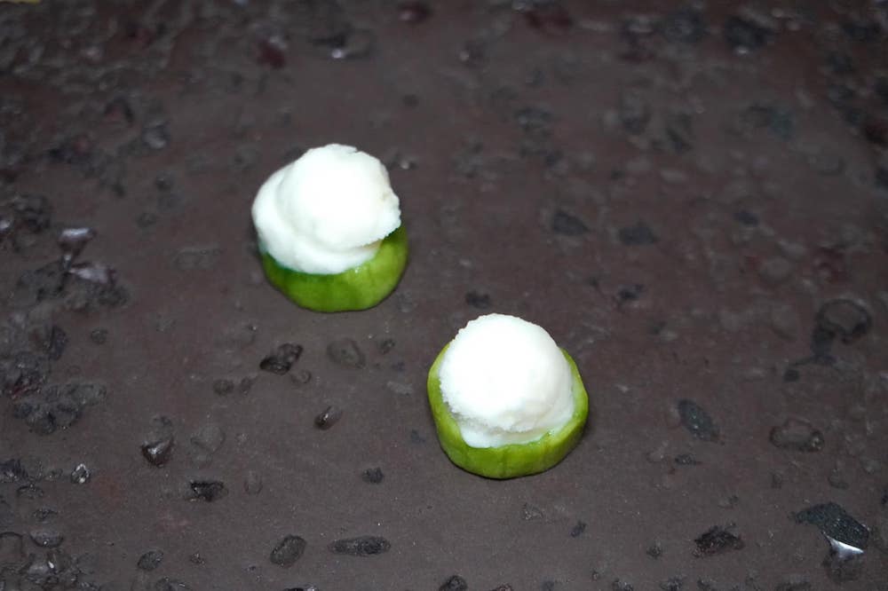 ถัดมาเป็นแตงกวากรอบเสิร์ฟมาคู่กับซอร์เบท์ที่มีส่วนผสมของเมลอนและแองโชวี่ (14/20)