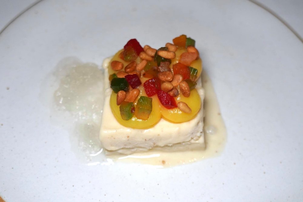 Amb Fruita Confitada เป็นเค้กพื้นเมืองหน้าผลไม้เชื่อม (Candied Fruit) เชฟได้ปรับเปลี่ยนรูปแบบการนำเสนอจากเค้กปกติมาเป็น Iced Cake ทอปด้านบนด้วยครีมสีเหลือง, เมล็ดสน ขนาบข้างด้วย Cava ซึ่งเป็น Sparkling Wine ท้องถิ่นทำออกมาคล้ายเจลลี่นุ่ม ๆ (16/20)