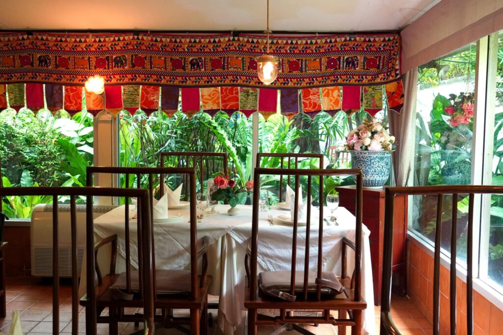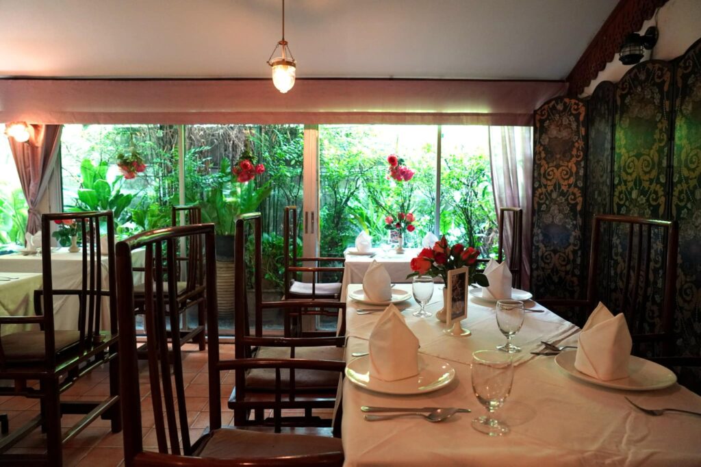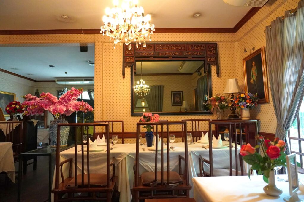 ภายในตกแต่งให้ดูหรูหราร่วมสมัย เก้าอี้ไม้และผ้าปูโต๊ะสีขาวรับกันกับแสงไฟที่ส่องมาจากโคมจิ๋วบนเพดานได้เป็นอย่างดี