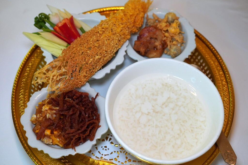 ห้ามพลาดเมนูขึ้นชื่ออย่างข้าวแช่สูตรชาววัง (ปกติแล้วสูตรของที่นี่จะใช้ข้าวแช่ในน้ำดอกชมนาด ดอกมะลิ และกุหลาบมอญ) เสิร์ฟมาคู่กับเครื่องต่าง ๆ ทั้งลูกกะปิที่รสชาติหวานกลมกล่อม โดดเด่นกว่าร้านทั่ว ๆ ไป หอมแดงโทนสอดไส้ หมูฝอย ไชโป๊วผัดหวานและไข่แนม ยังมีพริกหยวกชิ้นโตสอดไส้หมูและกุ้ง นึ่งมาสุกพอดี จากนั้นโรยด้วยไข่ที่ได้จากการผสมไข่ไก่และไข่เป็ด ทอดออกมาเป็นแพหรือที่เราเรียกกันว่าหรุ่ม สีเหลืองทองสวยงาม ไม่อมน้ำมัน ขนาดยาวเลยขอบพาน และผักสดทั้งกระชายแกะสลักรูปดอกจำปี ต้นหอม แตงกวา พริกชี้ฟ้า และมะม่วงจนกลายมาเป็นเอกลักษณ์ของร้าน รสชาติโดยรวมถือว่าดีงามกว่าร้านอาหารไทยทั่วไปพอสมควรเลยทีเดียว (13/20)